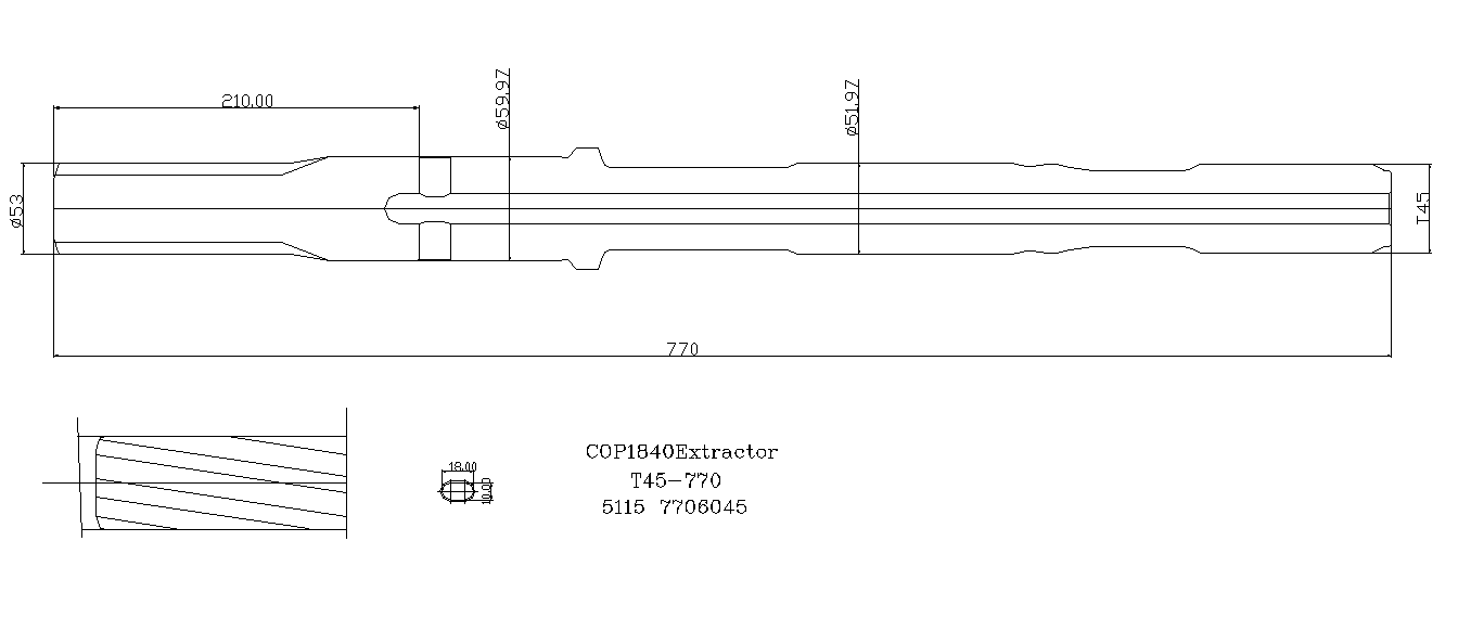The task of the shank adapter is to transmit rotation torque, feed force, impact energy and flushing medium to the drill string (extension drill rods, drifting drill steels).