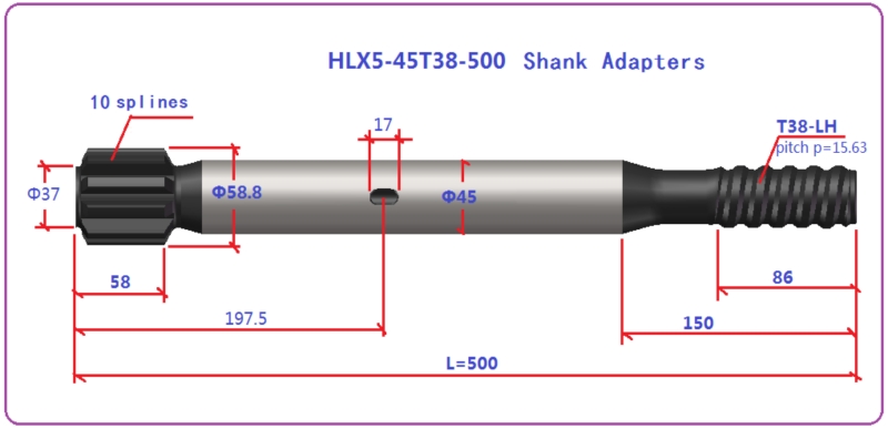 HLX5-T38-D45-500 Shank Adapter shank adapter. The code tells you everything: it's for Sandvik HL500 hydraulic hammer, with a 45-millimeter diameter shaft (D45), a T38 thread for the drill steel, and it's 500 millimeters long.